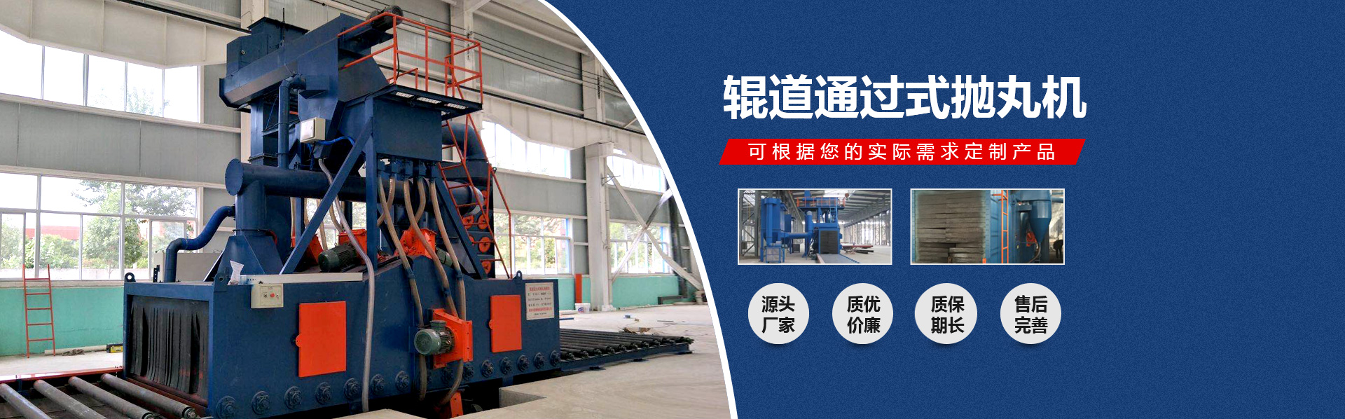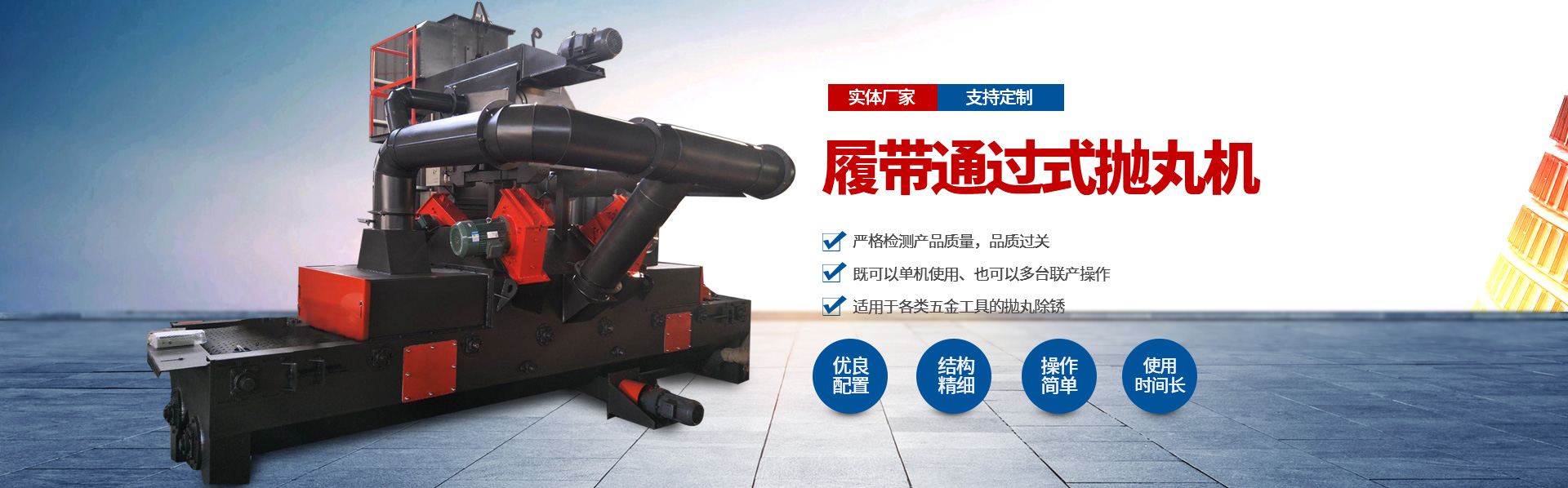 我公司集科研、設(shè)計(jì)、制造、安裝調(diào)試、售后服務(wù)于一體,技術(shù)力量雄厚,生產(chǎn)設(shè)備優(yōu)良,機(jī)械銷(xiāo)往全國(guó)各地,享有良好的信譽(yù)。主要產(chǎn)品 有:Q32系列履帶式拋丸機(jī)、Q37系列吊鉤式拋丸機(jī)、Q69系列大型鋼板預(yù)處理生產(chǎn)線、QG系列鋼管拋丸清理機(jī)、Q38/Q48/Q58懸鏈?zhǔn)綊佂铏C(jī)等系列拋丸清理機(jī);及各種型號(hào)的合金鑄件,耐磨配套件等。本公司亦可根據(jù)客戶要求進(jìn)行非標(biāo)準(zhǔn)設(shè)備制造。